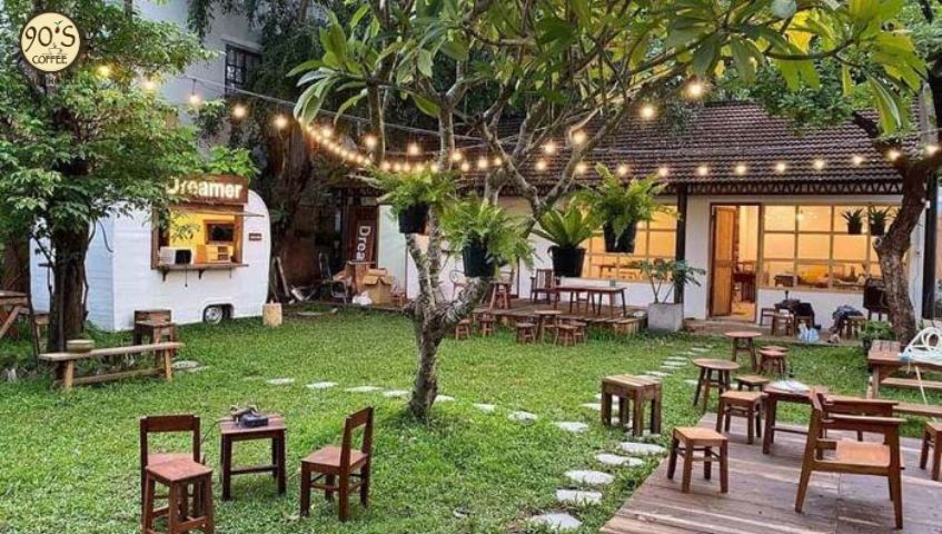 Cà phê sân vườn mang phong cách thiên nhiên, không gian rộng, thường sử dụng nhiều cây xanh, hồ cá, bàn ghế gỗ để tạo cảm giác yên bình