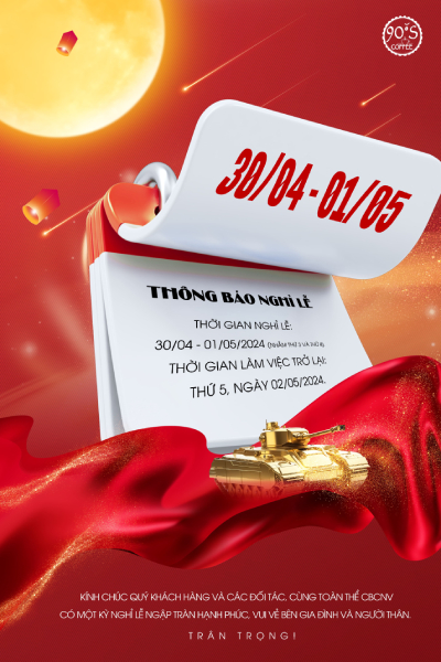 🔔 90S Coffee xin trân trọng thông báo đến Quý khách hàng, Đối tác cùng toàn thể CBCNV lịch nghỉ lễ Giải phóng Miền Nam (30/4) và Quốc tế Lao động (1/5) như sau: